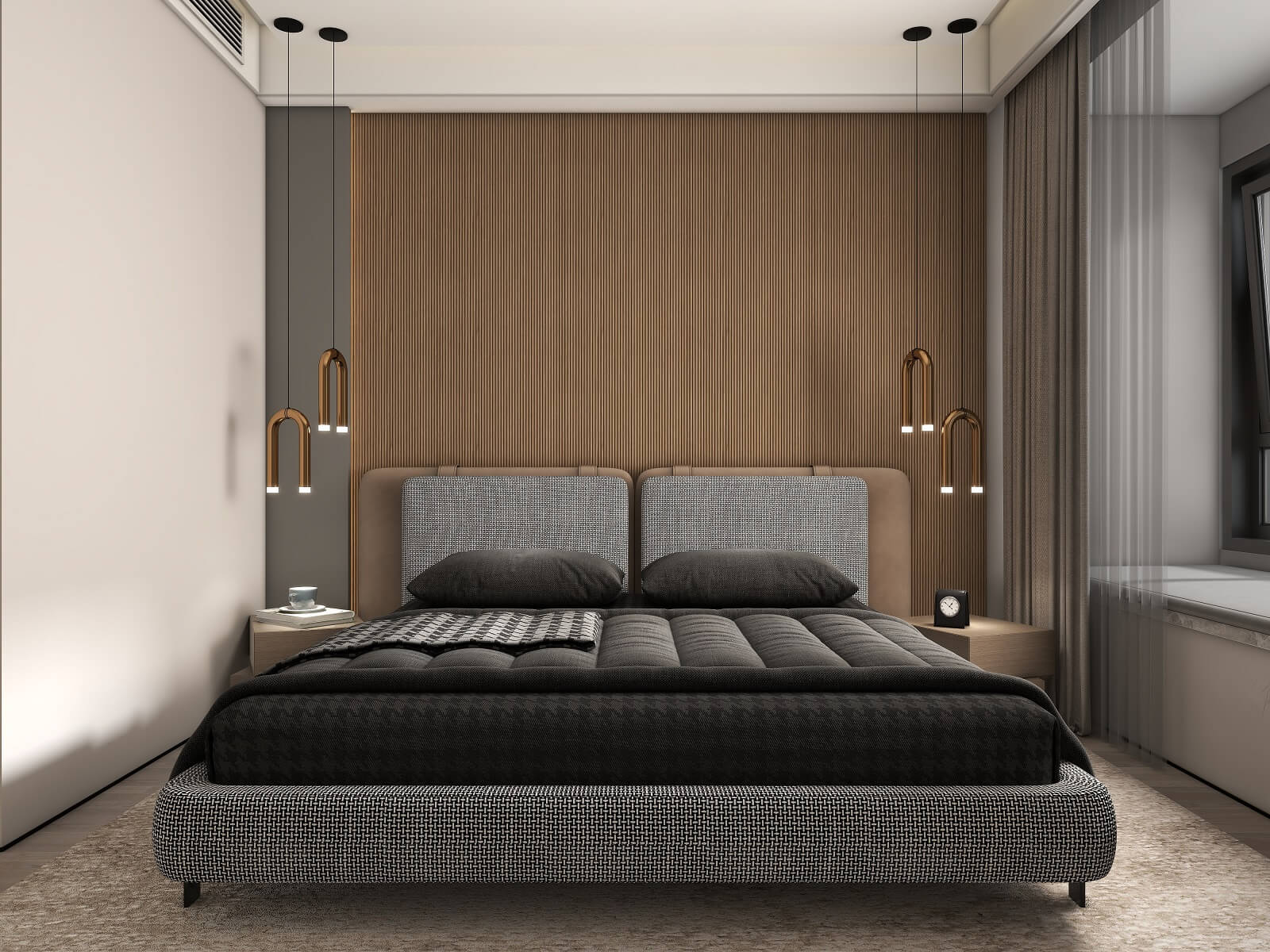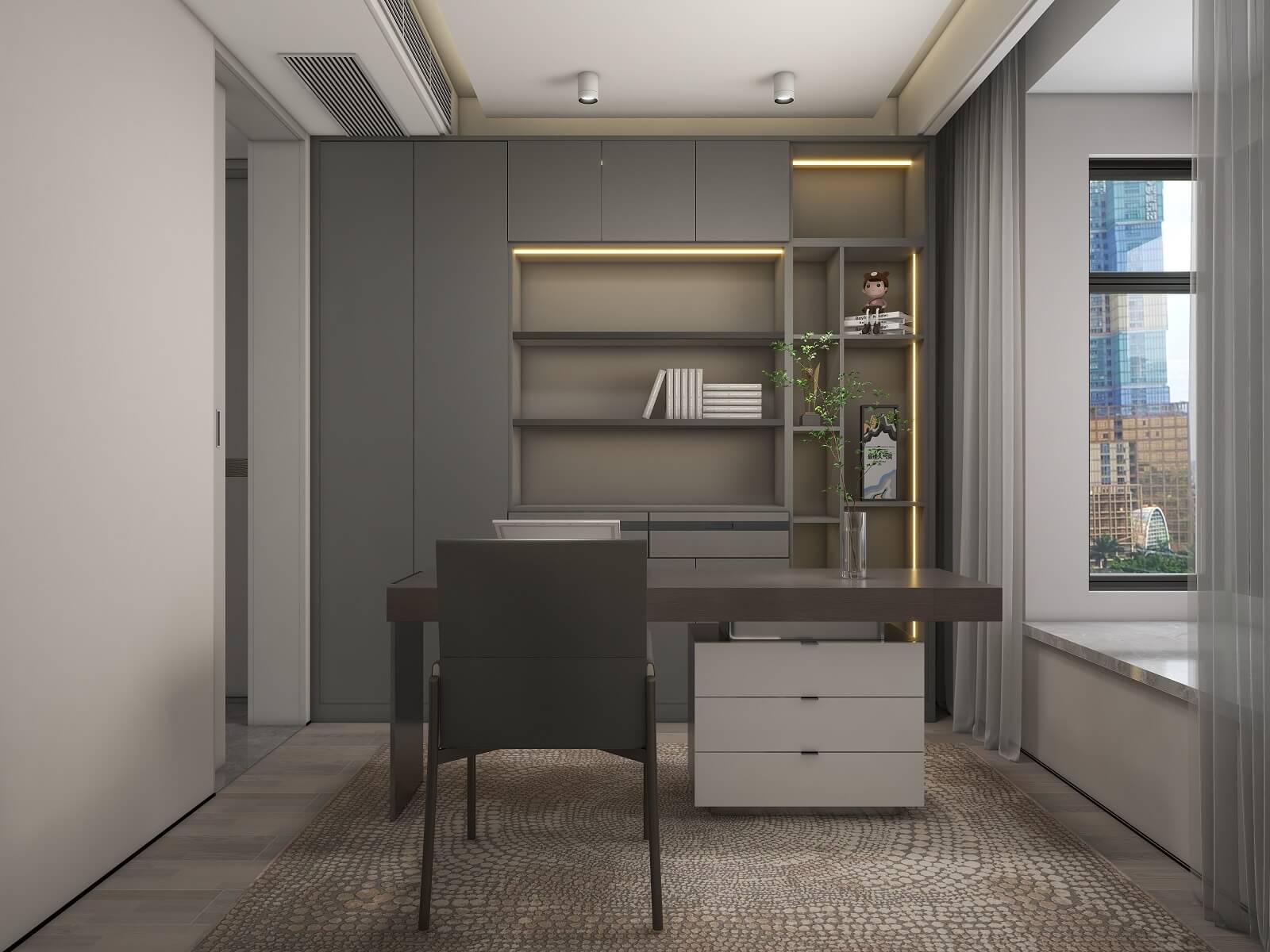 主臥的一切設(shè)計,都有助于睡眠氛圍的營造,黑棕色配合沉靜的物件,從材料到觸感,強(qiáng)調(diào)事物質(zhì)樸的內(nèi)在,能夠展示高端定制木作的本質(zhì)之美。